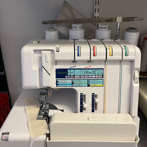 Symaskine, Ældre Eva Royal overlocker, model 787BD, med god solid bæretaske og div. tilbehør og 4 ruller hvid tråd.