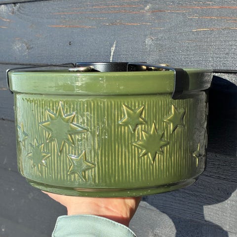 Vintage juletræsfod, grønt glas/metal, Schweiz/Bulach No. 520, 22 cm i diameter, 14,3 cm høj, plads til stamme ca. 5 cm i diameter.