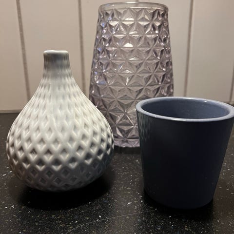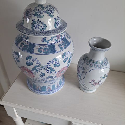 Sæt bestående af en blå og hvid porcelænsvase og urtepotte. Vasen er dekoreret med blomster og sommerfugle i blå på hvid baggrund. Urtepotten har en matchende blå og hvid farveskala med geometriske og blomsterdetaljer. Begge dele er lavet af porcelæn og egner sig til indendørs brug som dekorative elementer eller til opbevaring af planter.