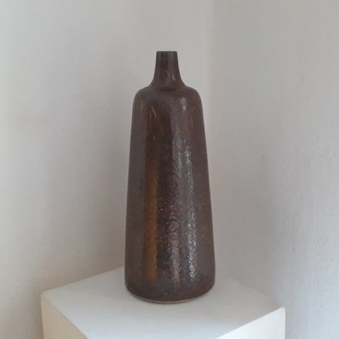Stentøj, Vase, Lavet af Henning Fjendbo, som har værksted i Spøttrup. Jeg ved ikke hvornår vasen er lavet. Brun og lys glasur.