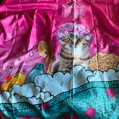 Badeforhæng, (Nye) Conzept, Nye gardiner, pris 65 kr. for to, 115 kr. farven er lilla.