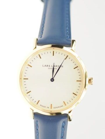 Smukt Lars Larsen dameur, model 146SDS, stålkasse, quarts urværk og safirglas, blå 30 mm skive og sort læderrem. Uden prismærke.
