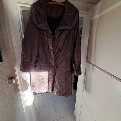 Frakke i brun farve til kvinder i størrelse 42. Jakken har en blød, lys foring og hætte, samt knapper foran. Materialet fremstår som imiteret ruskind med en varm, pelslignende indvendig foring. Jakken har lommer foran og en stjerneapplikation på den ene side.