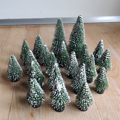 Juletræer i grønt sælskind, Unikke, mini juletræer i grønt sælskind. 7 cm høje med metaltråd og træstjerne.