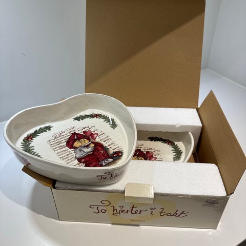 Etly klarborg 2 hjerter i brand stort hjertefad, Etly klarborg 2 herter i brand stort hjertefad aldrig brugt. Måler 27 cm. Se evt også vores andre ann. med disse skønne nisser og tilbehør fra Etly Klarborg nisseserie. Fadet står som nyt aldrig brugt. Fra ikke ryger hjem.