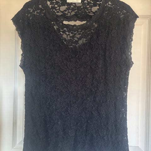 Rosemunde sort, kortærmet blondebluse i størrelse S. Blusen har blonder ved hals og ærmer i mørkeblå og sort. Den lukkes med to knapper i ryggen. Den er meget tætsiddende, men giver sig også meget. 70% silke og 30% bomuld (blonde i polyester, polyamid og elastan). Helt ny med prismærke. Nypris: 499 kr