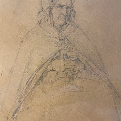 Jørgen Sonne akvarel, "Nonner spadserer i Klosterhaven, Rom", studie ca. 1866, Signeret I. S., vandfarve og bly på papir. Lysmål: 22×19 cm. Mål med ramme: 47x40cm.
