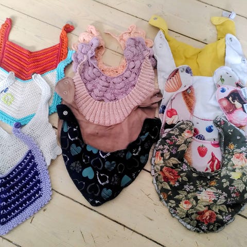 Da hendes storebror storsavlede, købte jeg ind i stor stil. Hun savlede overhovedet ikke, så enkelte på billede 1 har været brugt højst én gang eller to, men de fleste har aldrig været brugt!