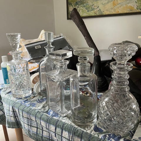 Karafler, Krystalglas’ - egetræ , 1940 år gl., Sælger dette fede sæt, 3 stk karafler i krystalglas, med sølv skilte på, whisky, cognac, portvin.