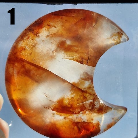 Lille udskåret måne i en slags kvarts eller kvartsglas, ca. 3,5-4cm og 70g. Den er aura-coated og skinner i alle regnbuens farver, afhængigt af lyset.