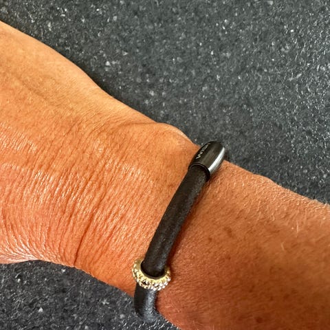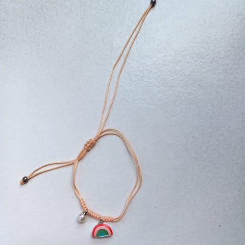 flot lille armbånd i snor,jeg tror det er fra scroples,er købt ved guldsmed,sammen med det andet armbånd,der er en lang række af små kugler,(tror det er sølv) på front af armbåndet.indstilles efter behov.sælges sammen med støt cancer armbåndet for kun 50 kr