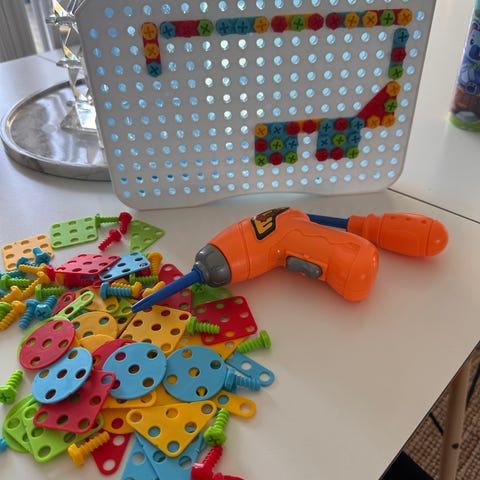 Værktøj, Værktøjssæt, Sjovt byggesæt til den lille dreng. Hjelm, værktøjs taske, seler og skruemaskine