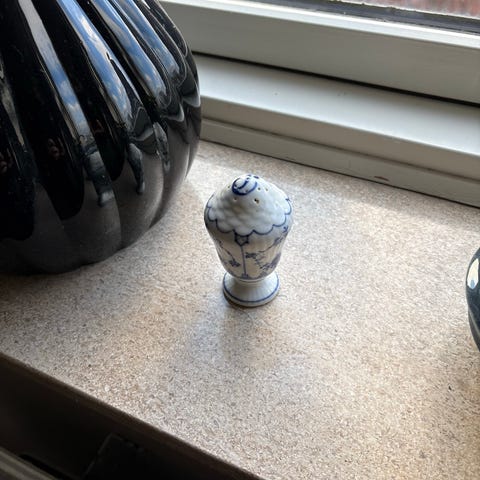 Porcelæn, Musselmalet saltbøsse, Royal Copenhagen, 2 fine saltbøsser, Musselmalet. 1.sortering. 8.3cm høj. Den ene er i perfekt stand (nr 1) og sælges til 350kr. Den anden ( nr 2) har et lille skår på toppen, som dog er svær at se uden lup. Nr. 2 sælges til 250 kr
