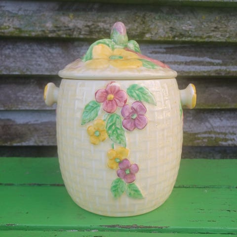 Gammel lågkrukke fra det engelske James Dixon & Sons, Sheffield, perioden 1879-1927. Lille kop-form med hank/hængsellåg og glasindsats. Hul til ske. Usikker på metallet: Ligner mest af alt at det meste er i stål, mens hank er i tin.