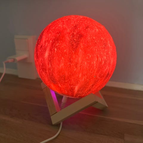 3D laserindgraveret stor måne i massiv krystalglas kugle på USB-drevet sokkel af træ med hvidt LED-lys.