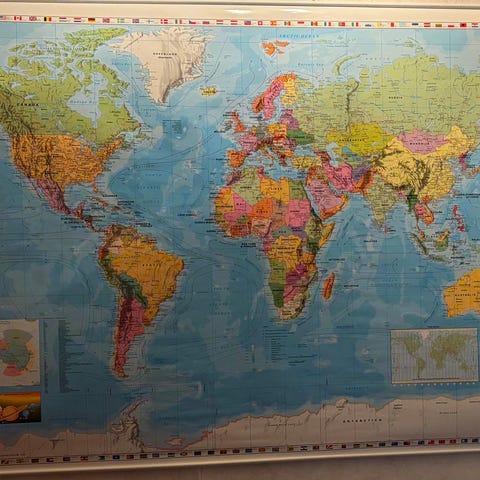 Landkort, Nyt væg verdenskort i sort og sølv 97 cm x 67 cm, Nyt verdenskort til væg i sort og sølv med snor til ophæng