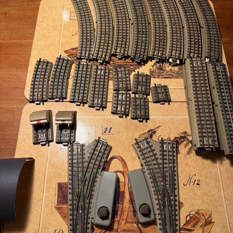 Modeltog, Sæt M-Skinner med fuld mitderleder. Passer fint sammen med alm. M-skinner med punkt midterskinne. H0 AC. 10 lige 12 r360 bue og 4 stumper, har flere sæt så billederne er eksempler.