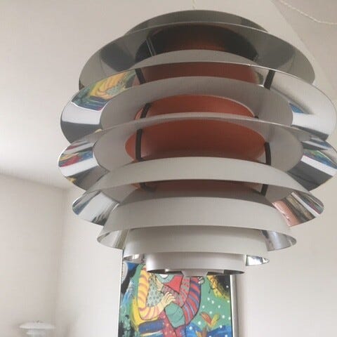 Kontrast' pendel med 10 aluminiumsskærme. Udvendigt: Hvide og blankpolerede. Indvendigt: Orange. Formgivet i 1962.