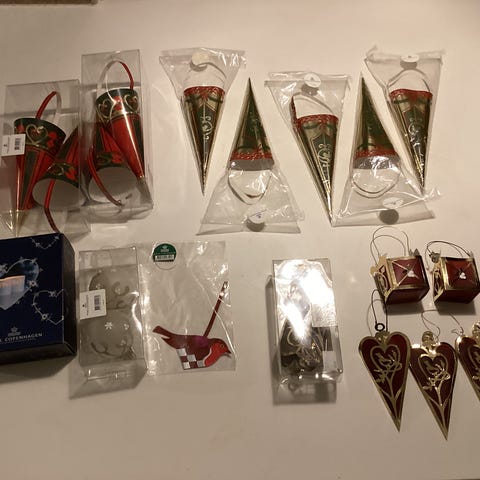 Royal Copenhagen Guld Julepynt, Samlet pris Lot af sjældne og ubrugte RC kræmmerhuse, også i emballage Royal Copenhagen glaskugler, guldophæng med engle og 4 musselmalede GULD FLETTEDE HJERTER(ukendt).