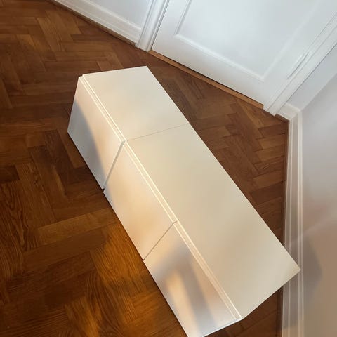 Tvreol, Trævarefabrikken, Møbel til TV eller andet. Hvidmalet med hjul.