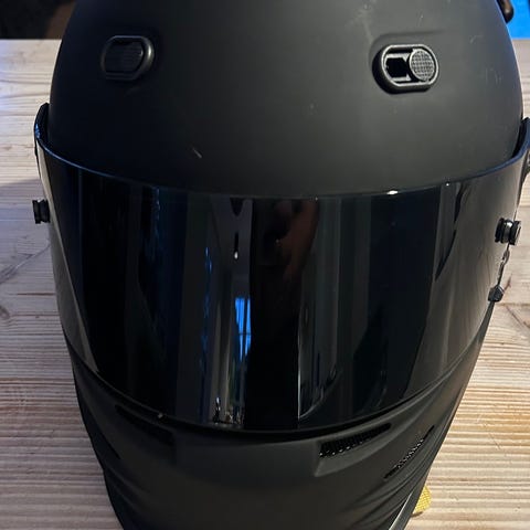 Sådan har jeg kørt med den, derfor er visiret så godt som nyt, det mørke visir er monteret, det gennemsigtige lovpligtige er aldrig blevet brugt.