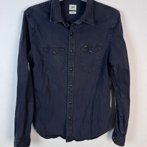 Skjorte, Lee Western Shirt - UBRUGT, str. 38, 40. Medium. Sort. Købt for lille. To brystlommer. Flot, snit på ryggen øverst. trykknapper. Bomuld. BV 50x2 cm. Længde 74 cm. Nogle foto er lysnet. Vægt 435 gr.