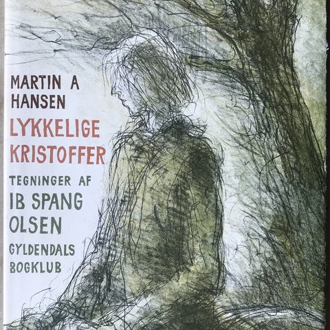 Lykkelige Kristoffer, Martin A Hansen, genre: roman, Den dramatiske 1500-tals roman om den ludfattige Kristoffer, der for at kunne udføre store heltegerninger forlader Halland og drager med tiggermunken Mattias mod Danmark. m navn på friblad,