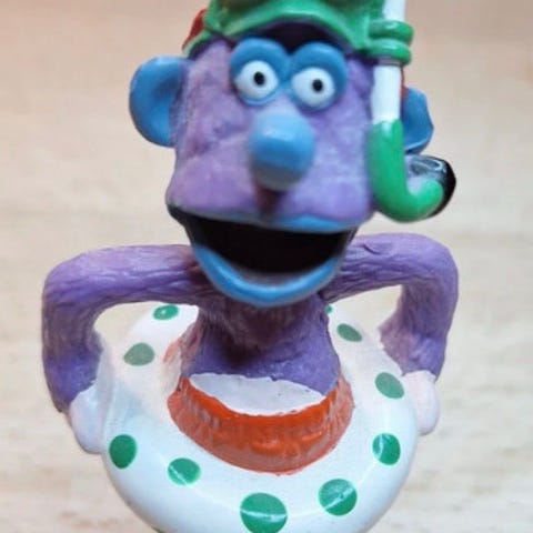 Han er ca. 8 cm høj i hård tung plastik, posen er lidt krøllet ellers fin stand. Den ene ud af tre er solgt