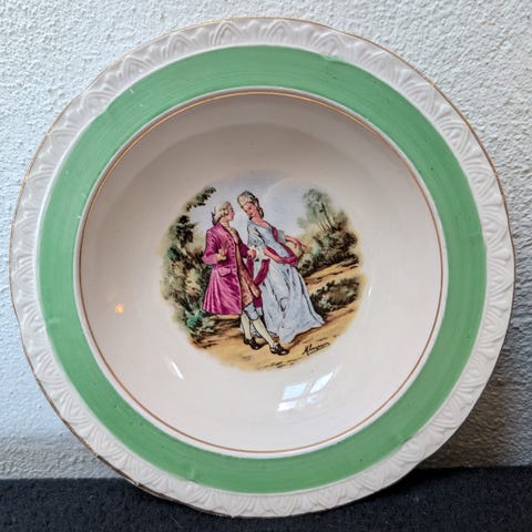 Selve skålen er i ret flot stand alderen taget i betragtning. Selve underfadet er meget krakeleret , har hårrevne og med afslag, det ser man dog ikke når skålen står på det. Kan også bruges hver for sig. Flot til blomsterdekorrationer. Jeg har blot haft dem stået i en reol til pynt. Helst afhentning.