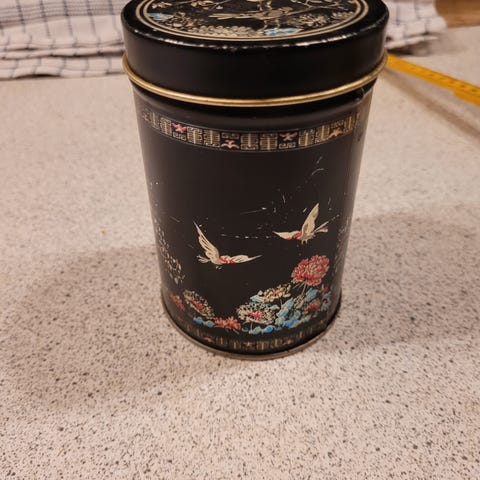 En skøn ældre grøn cylinderformet te dåse fra Glud & Marstrand med fine guld dekorationer og med ”Tea” i guldtryk.