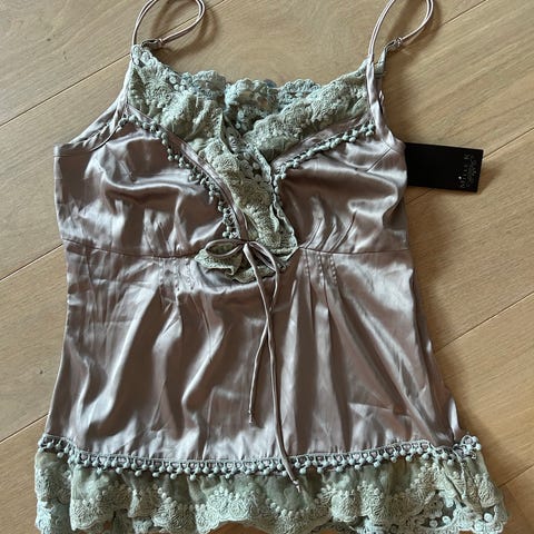 Top, Mille K, str. 36, Lysgrå, 100 % poly satin, Ubrugt, Smukkeste top i vintage stil med mange flotte detaljer i det lækreste silkebløde materiale, stropperne kan indstilles. Lynlås i den ene side.