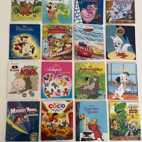 Der bøger med disney prinsesser ariel, Belle, askepot og Jasmin fra Aladdin, samt Disneys Lilo og Stitch, 101 dalmatiner, Rasmus klump og anders and rip, rap og rup