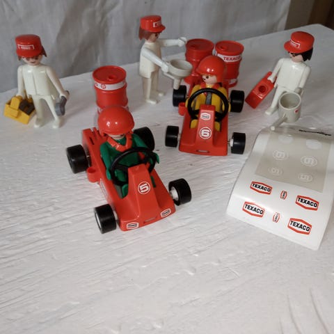 Playmobil 3523 – 2 Go-Karts / Racing-sæt (vintage, ca.1979) Et sjovt og nostalgisk sæt med to små gokarts og tilbehør. perfekt til leg eller som retro-tilføjelse til en samling.