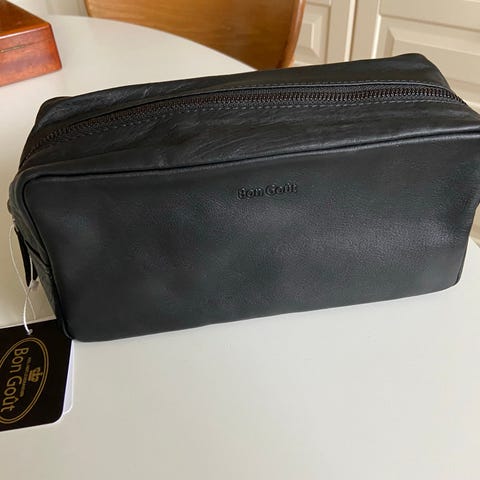 Toilettaske, Bon Goût, Raflegave fra Lomax. Lædertaske til toiletsager, til m/k?, 24 cm lg x 9 cm br x 12 cm h. (Lomax skriver det er læder), i cognac farve. Lidt større end 1 l mælk, med 2 indvendige lommer. Ubrugt. Nypris: 499,-. Kan bringes til Roskilde/ Hvidovre