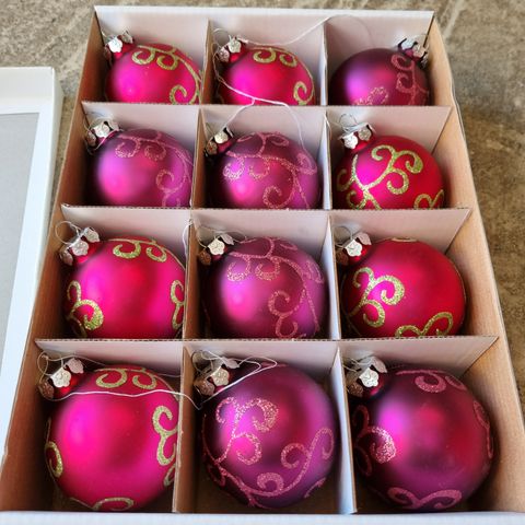 6 store lyslilla kugler i spand. 3 matte, 3 blanke. 8 cm i diameter