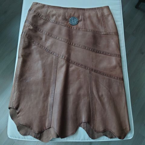 Flot, brun/grøn, foret nederdel i lammeskind og patchwork-stil; livvidden er ca. 82-83 cm. Str. 38. Aldrig brugt. Sender gerne.