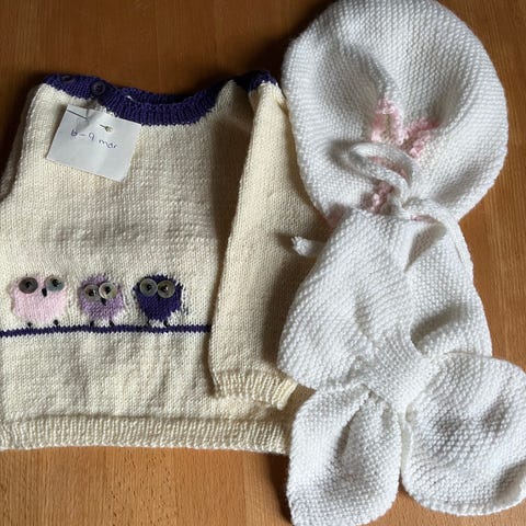 Hæklet Krave 30.- .(På foto 2+3 sokker, vanter 10.-/15.-. Suttesnor 15.- Sko 20.-/35.-).. 2 nye bodyer 35.-Ialt. Ny Bluse 25- ny Sut til baby på 0 - 3 mdr. 25.-. Nyt lyserødt Buksesæt sælges til under ½ butikspris 55.- Se mine andre annoncer med babytøj. Alt kan købes hos mig i Nivå eller sendes med GLS. Min. køb: for 25.-Priser Fra: