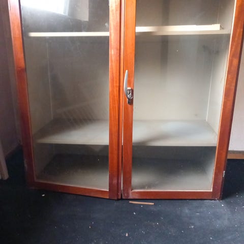 Butiksdisk, 85 år gl., b: 150 d: 63 h: 101, lavet i glas og messing med skuffer og skydelåger, samt indbygget lys. Kommer fra Skindstuen i Roskilde.