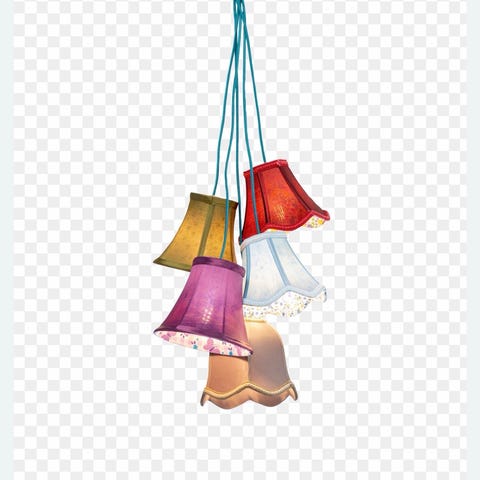 Lampens skærm er lavet af farverigt syntetisk stof, der skaber et smukt lysmønster.