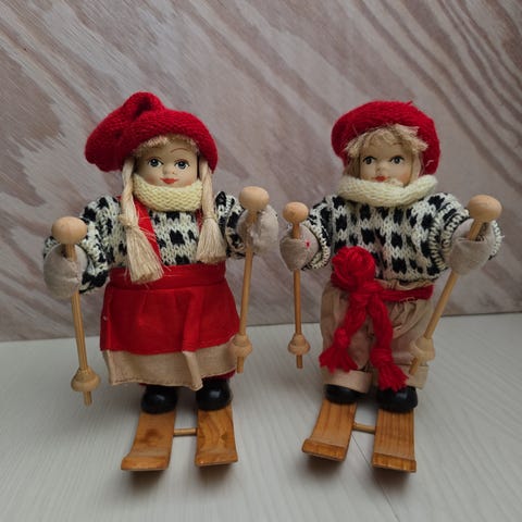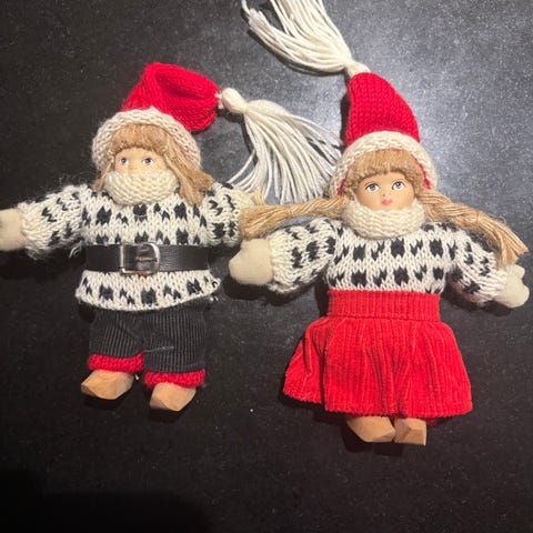 Begge er i deres fineste juletøj og nissehuer og er lige til at stille i nisselandskabet eller sammen med andet julepynt og grønt i et fint juletableau.