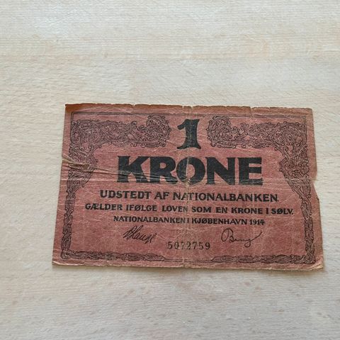 Skandinavien, sedler, 1 krone, 1917, Norsk 1 krone seddel fra 1917 udstedt af Norges Bank. Brugt, men i pæn stand. Sælges fra 9300 Sæby.
