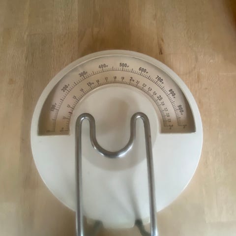 Eva mini vægt, Til breve og diæt. Gammel - kan veje op til 500g men starter på 50g, da jeg ikke kan få pilen ned på nul. Måske kan det fikses. Inklusiv æske.