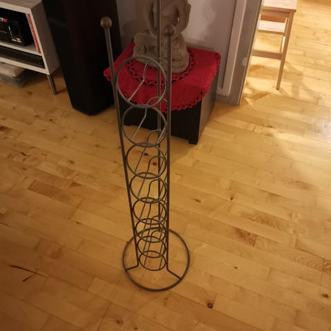 Metal vinflaskeholder med dekorative blade, designet til opbevaring af vinflasker. Holderen har en rund form med udskæringer og et håndtag øverst for nem transport. Den er velegnet til opbevaring og præsentation af vinflasker i hjemmet.