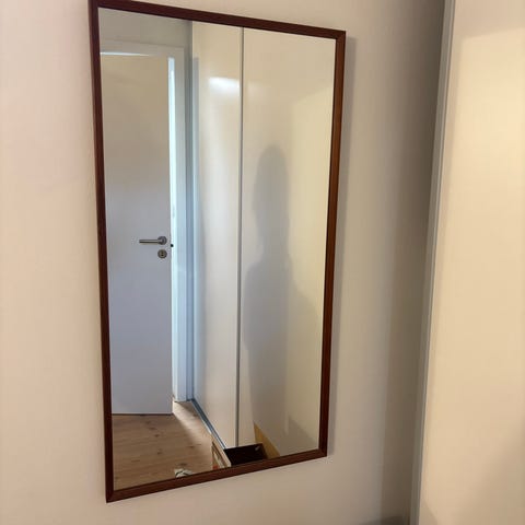 Retro spejl, i teaktræ. Mener det er fra 1960’erne. Mål se fotos. Alderleds form på spejlet, asymetriske. Alder og oprindelse ukendt. Håndtaget er i god stand. Spejlet har pletter, skjolder- har forsøgt at tage fotos. Se også mine andre annoncer- sender gerne til pakkeshop fra kr 44.-