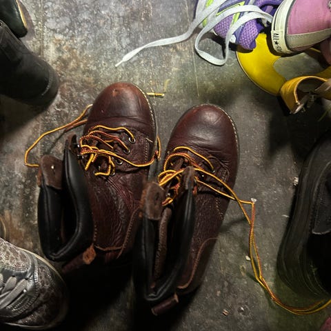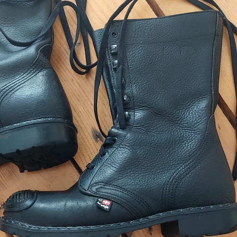 De er brugt og slidt indvendig ved hver hæl. Samt diverse. Derfor sælges billigt. De er super fede. Rå. Indtil videre har de været vandtætte for mig. Robust slidstærk læder. Jeg har beskrevet så godt jeg kan. Brunt foer hvor hæl som sagt er slidt hul i.