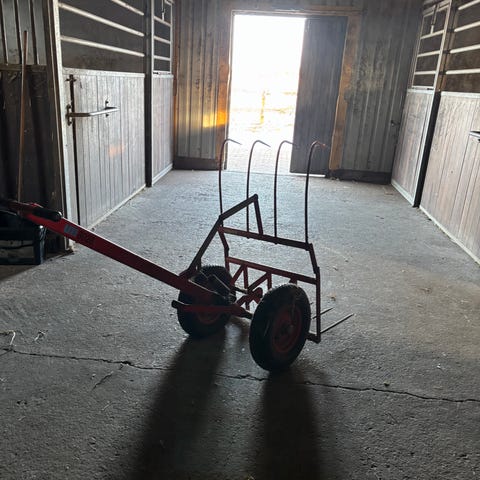 Chapman BT500 ballevogn, der kan transportere rundballer og Minibig. Vi har kun brugt den få gange, for da vi fik en minilæsser kort tid efter kom den lidt i overskud. Vi har selv købt den direkte fra importøren til 26.500 kr. ekskl. moms.