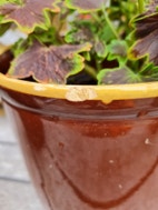 6 liters, lille og stort afslag på kant, se foto 5 og 6, ses ikke når der er blomster i :-) se to sidste fotos, den har også lidt brugsspor på glaseringen.. men skøn stor krukke..
