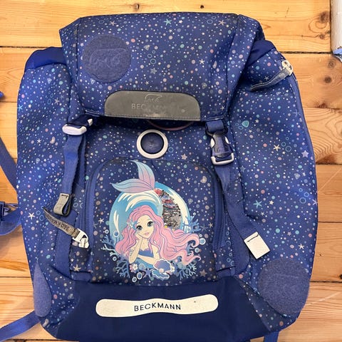 velholdt og i pæn stand, alle spænder i orden, 3 bages, lys blinker ved tryk , lilla, rosa, gyldne, og blå farver , mange lommer , robust kvalitet , polyester,