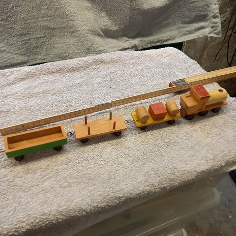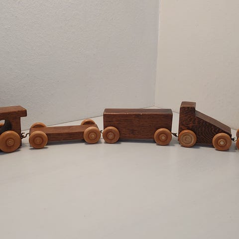 Legetøj, Trætog, Sælger et fint træ tog som aldrig har været ude at køre. Toget er stadig i emballage og består af lokomotiv med 3 tilhørende vogne. Evt porto betales af køber.