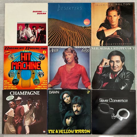NEDSAT!: Flot boks med 10 LP'er, alle i VG/VG+ stand. Instant samling, mange timers skøn vintage musik til en billig penge. Hver LP har et tema, se billedet.